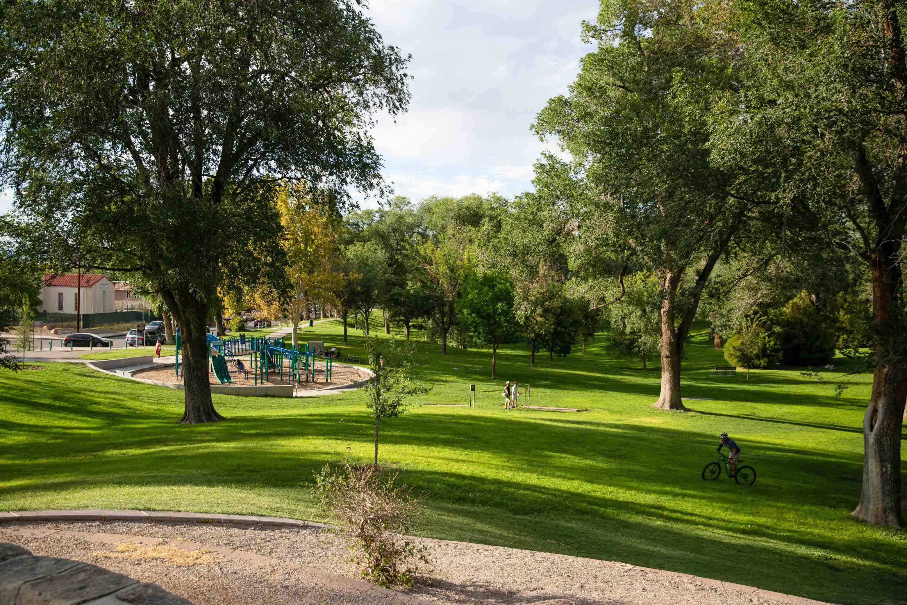 Roosevelt Park is located in Albuquerque, New Mexico. This historic park is recognized as an Albuquerque Historic Landmark and is included on both the New Mexico State Register of Cultural Properties and the National Register of Historic Places. Between 1933 and 1935, manual laborers employed by President Franklin D. Roosevelt’s New Deal programs converted a sandy arroyo full of rubbish into a rolling, lush environment planted with more than 2,000 trees and plants. It has long been a popular destination for entertainment and socializing in the city.